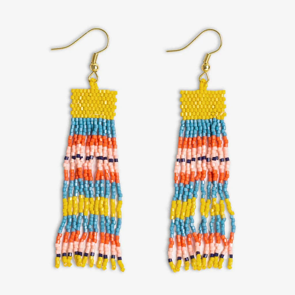 Elevate your look with the Billie Mixed Horizontal Stripes Fringe Earrings in Amalfi! Adorned with Lemon, Dark Blue, Coral, and Rose Pink hues, these earrings bring a delicate touch to your style. The tiny glass beads create a fine and intricate pattern, perfect for adding a pop of color to your ensemble