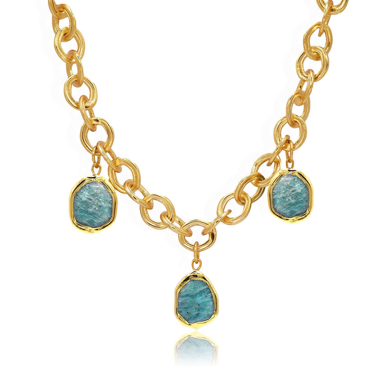 Statement necklace featuring our signature etched link collar chain necklace, adorned by 3 large elongated polished amazonite natural stones.