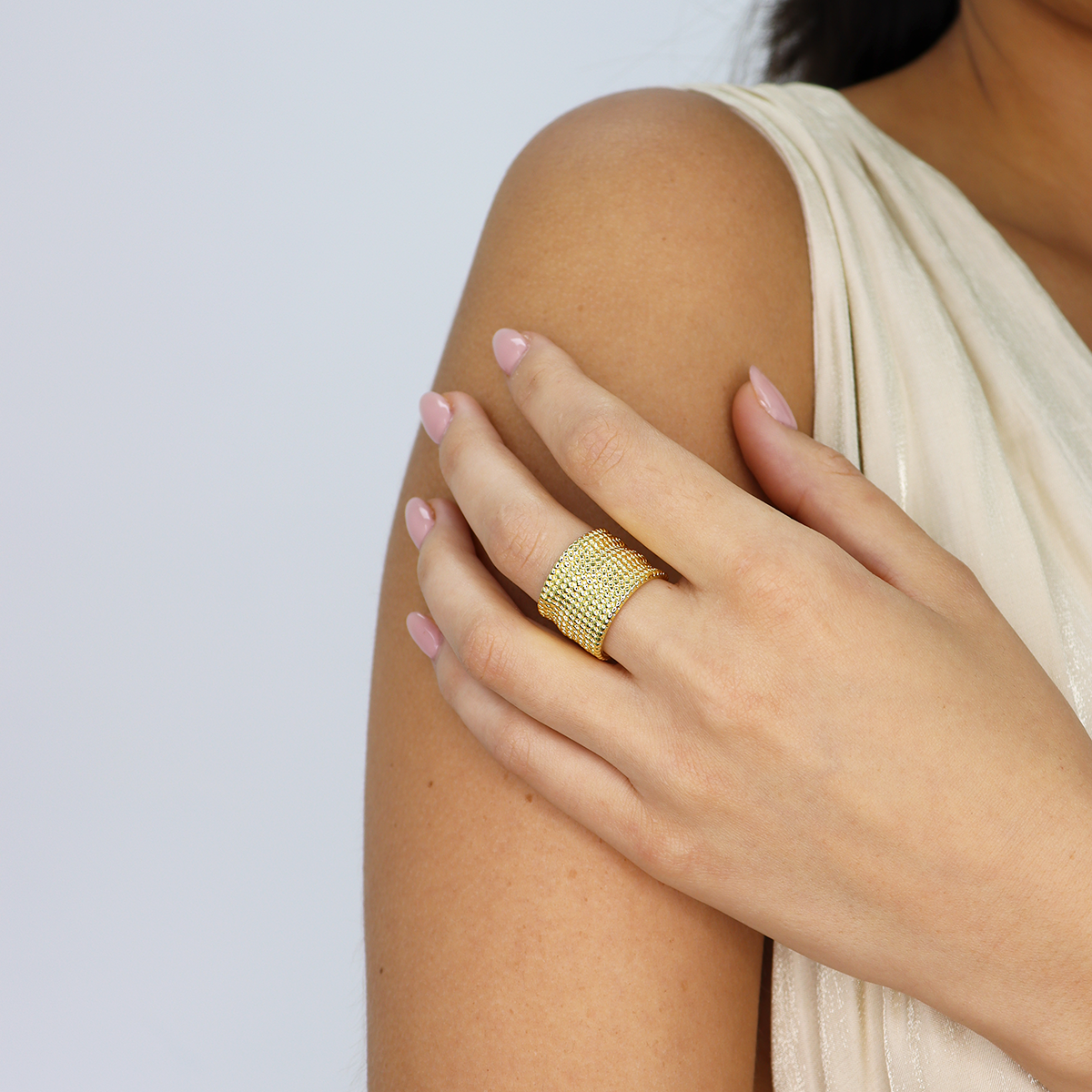 Our chainmail ring was envisioned after our most popular wrist cuff. This inspirational ring is created with a highly textured chainmail design that is repeated from top to bottom creating a hard wear affect that is a must-have for those that seek to make a bold statement style. Artistic and dramatic, this open ring is all you need to complete your look.