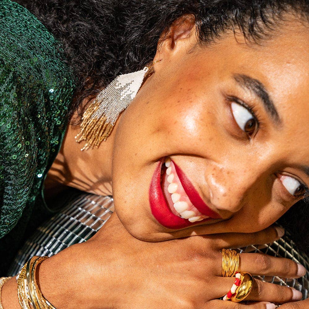 Whether you're making a statement at the office holiday party or just bringing some spirited glam to brunch with the girls, the Claire earrings are guaranteed showstoppers. Let their swingy metallic fringe elevate any ensemble, from elegant evening looks to tried-and-true vintage denim.