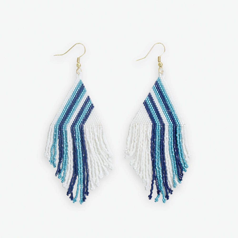 Cheer on your team in style with the Haley Game Day Stacked Triangle Beaded Fringe Earrings. These shoulder-dusting earrings feature layered triangle shapes strung with light blue, navy, and crisp white seed beads in a bold colorblocked design. Tiers of beaded fringe dangle below, swaying gracefully with every movement. Get into the gameday spirit with a modern bohemian twist when you accessorize with the vividly beaded Haley Stacked Triangle Fringe Earrings. They're a showstopping way to support your team and complete your game day outfit. --DETAILS-- 4" L, 1.25" W Handmade by skilled artisans in India Hypoallergenic nickel + lead-free brass hardware These accessories are made by human hands. A slight variation in size and color is considered part of the beauty of these one-of-a-kind pieces.