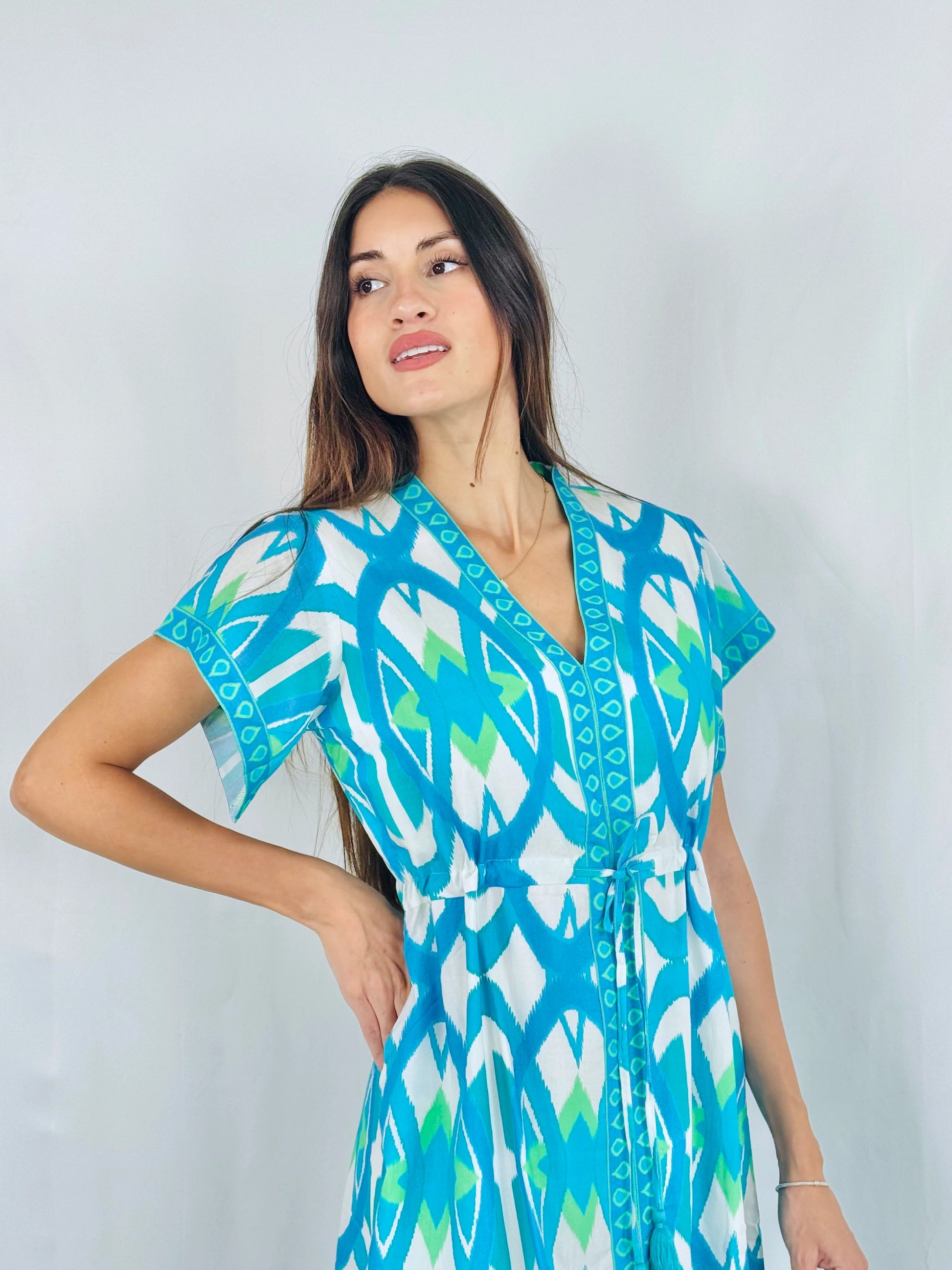 The Isla maxi is a flattering dress, with beautiful border trims running down its length. We love the drawstring waist that slims you down. This silhouette is very flattering on all shapes and sizes- it will be a staple in your wardrobe. There are two pockets on the side seams.