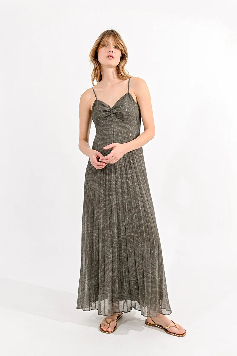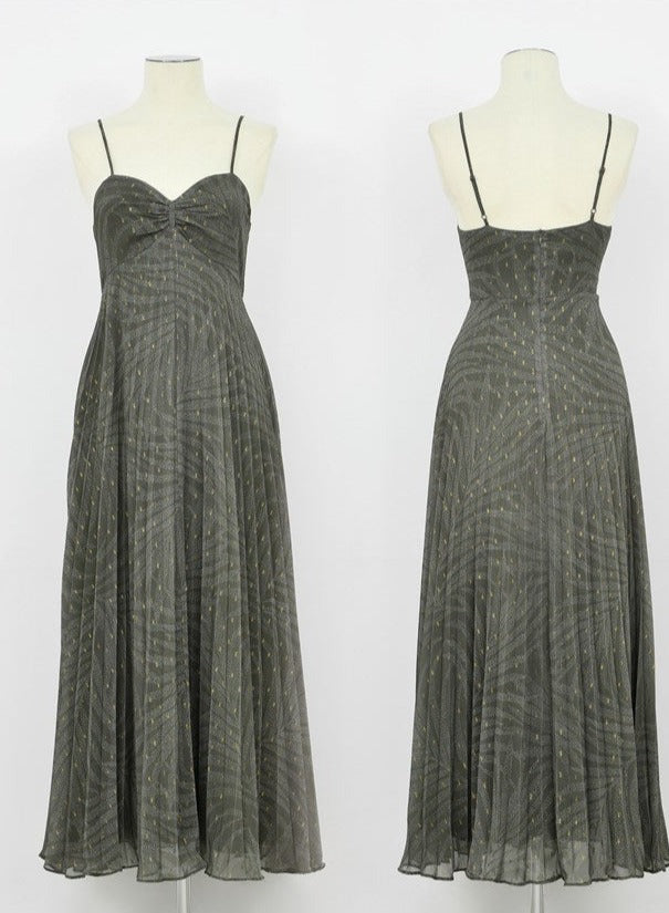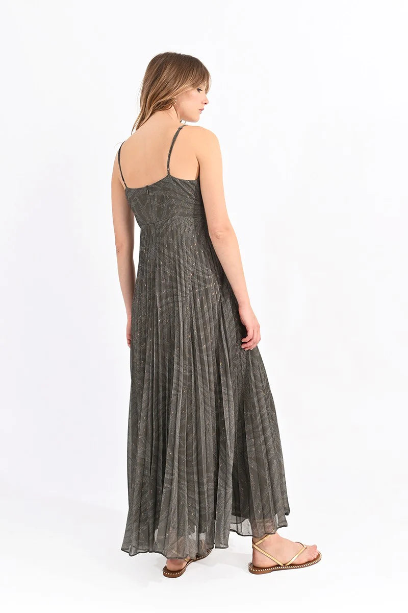 Elegant silhouette with this maxi veil dress. We love its pleated, palm veil print and spaghetti straps