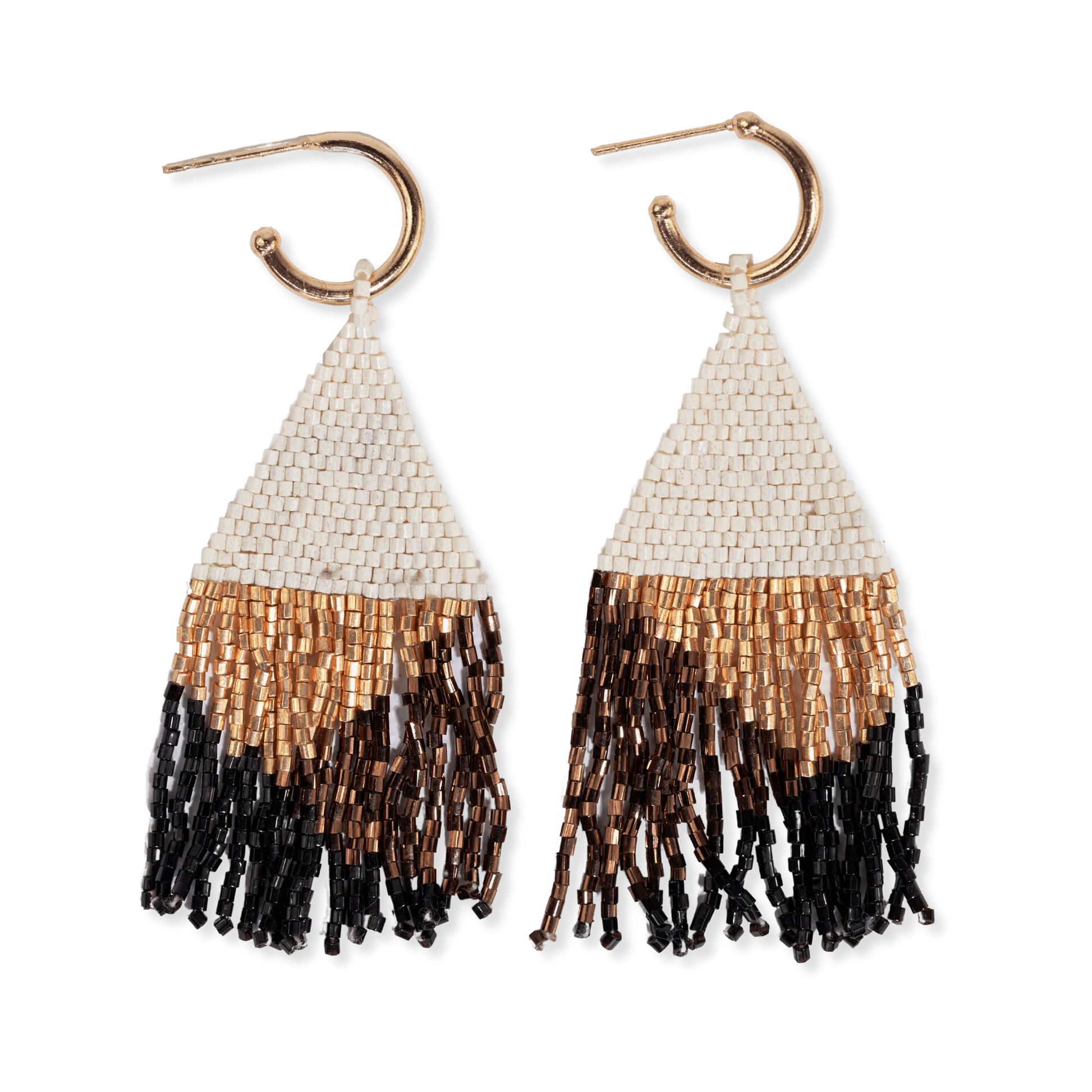Luxe Brass James Mini Gold Hoop Colorblock Beaded Fringe Earrings offer a versatile and chic accessory option. These brass hoop earrings feature a unique color-blocked design with navy and white beads. The earrings can be worn in two ways: attach the short fringe for extra flair, or wear the hoops on their own for a more understated look. With a length of 2.5" and a width of .94", these hoop earrings are a stylish choice for adding a touch of sophistication and playfulness to your outfit.