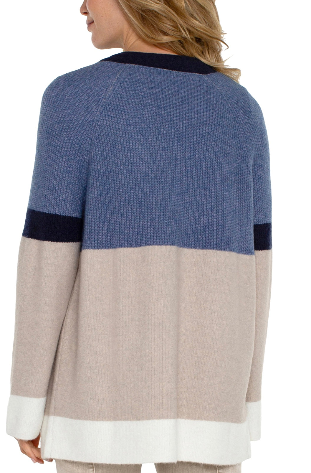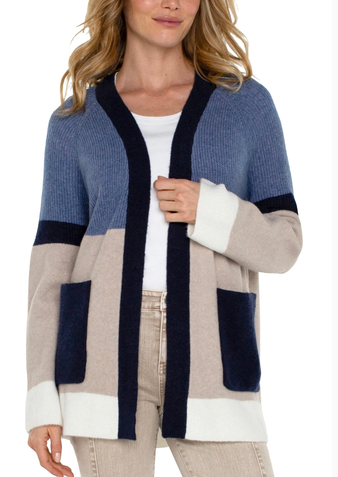 This luxuriously soft Open Front Cardigan features a color block of Lapis and Oatmeal for a sophisticated look.