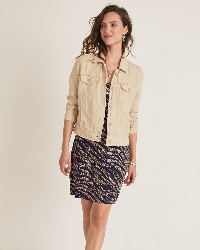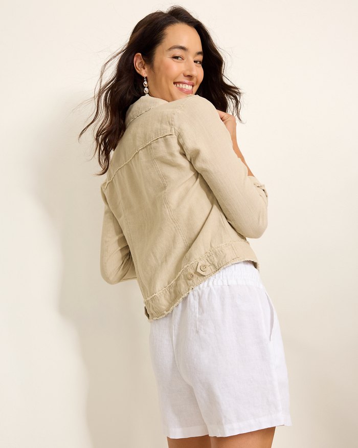 Temps may be rising, but you'll be cool and comfortable in this fun linen jacket. We've fashioned our fabulously smooth linen into a classic jean-jacket silhouette, so you can enjoy the look without the weight. Vertical seaming creates slimming lines, while raw edges add a touch of toughness. Pair it with your favorite cami, tank, tee, or dress for a great year-round look.