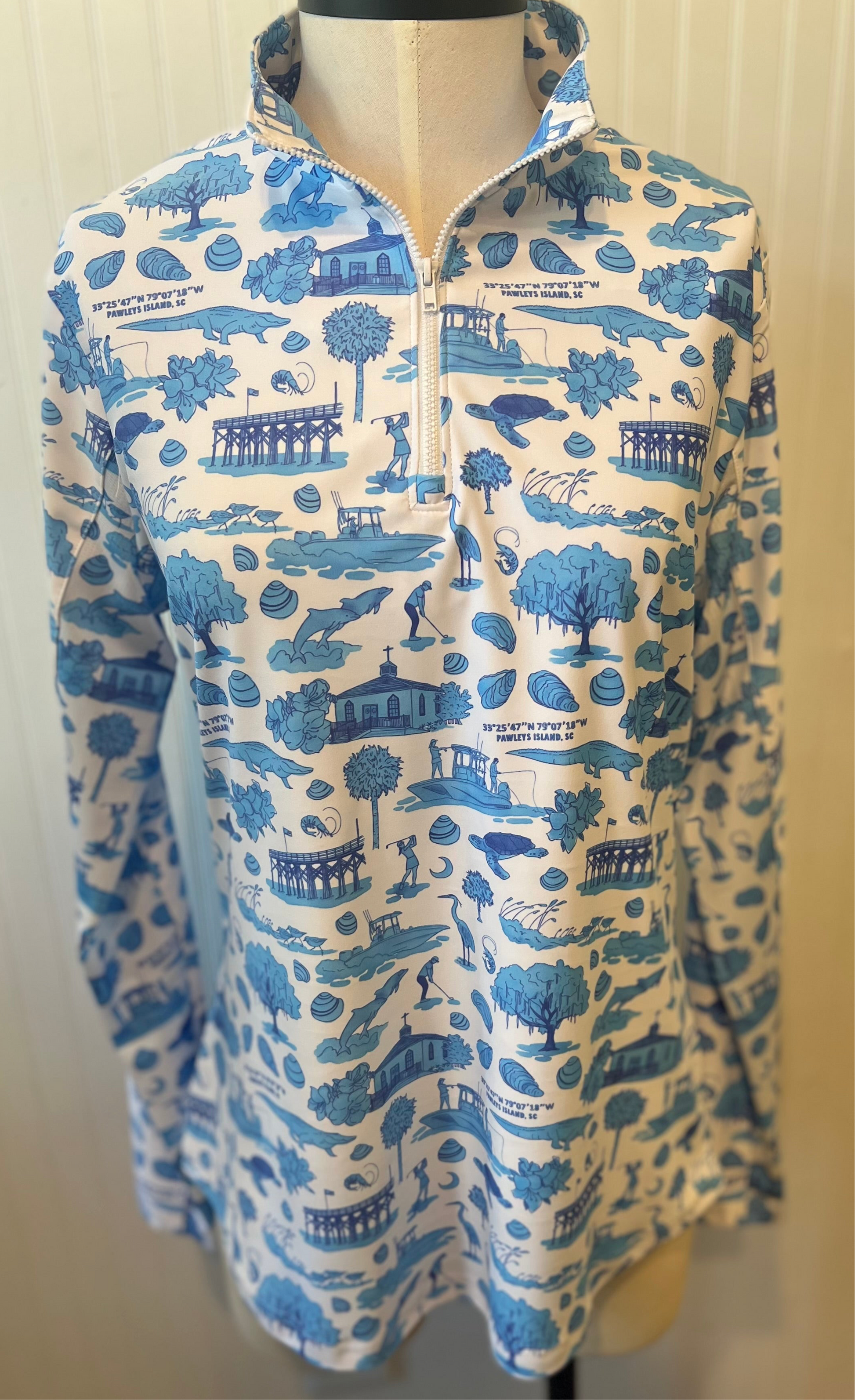 Experience elegance with Retail Therapy Boutiques exclusive Pawleys Island Print Quarter Zip. This exclusive print pairs perfectly with your favorite denim or skort, making it the perfect addition to your wardrobe. Sophisticated and tasteful, this quarter zip is made for those with refined taste.