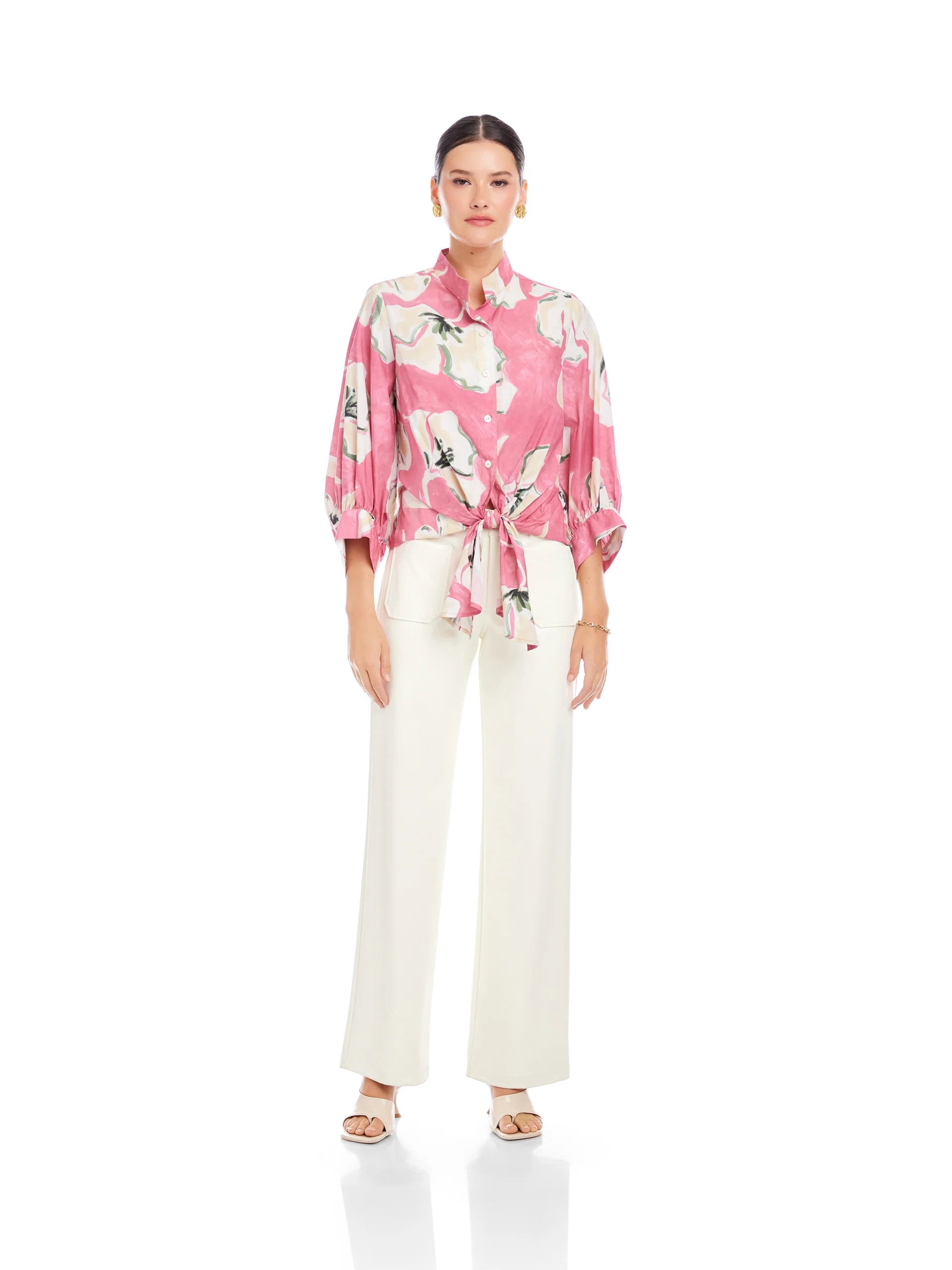 The Sawyer Tie-Front Top brings fresh, feminine style with its watercolor floral cotton fabric and relaxed silhouette. Designed with a subtle mandarin collar, button-front closure, and 3/4 sleeves, it features soft gathers at the cuffs and a flattering tie-front waist. Effortlessly chic, this top pairs playful color with polished ease.