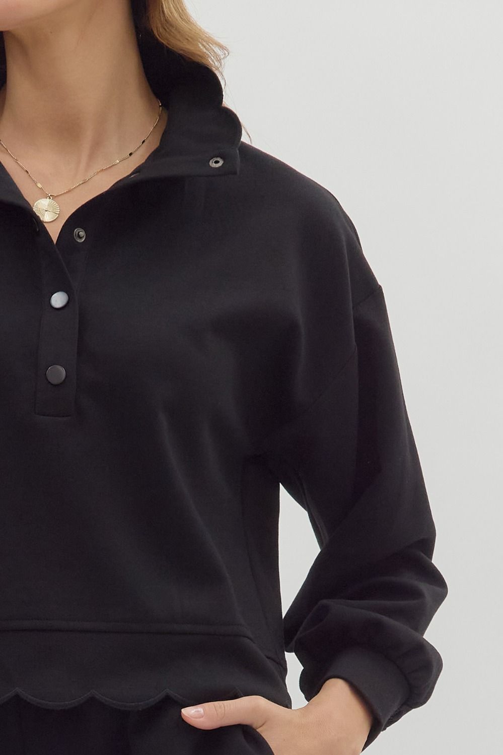 Solid long sleeve snap button closure pullover top featuring embroidered scallop edge finish. Unlined. Knit. Non-sheer. Lightweight.