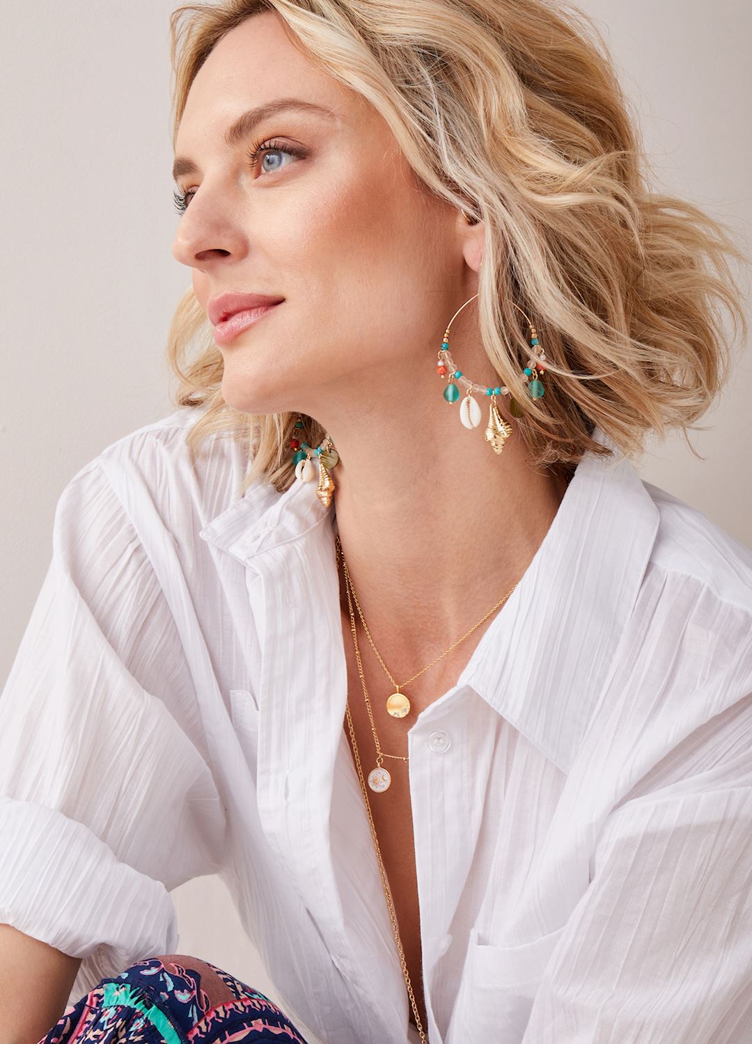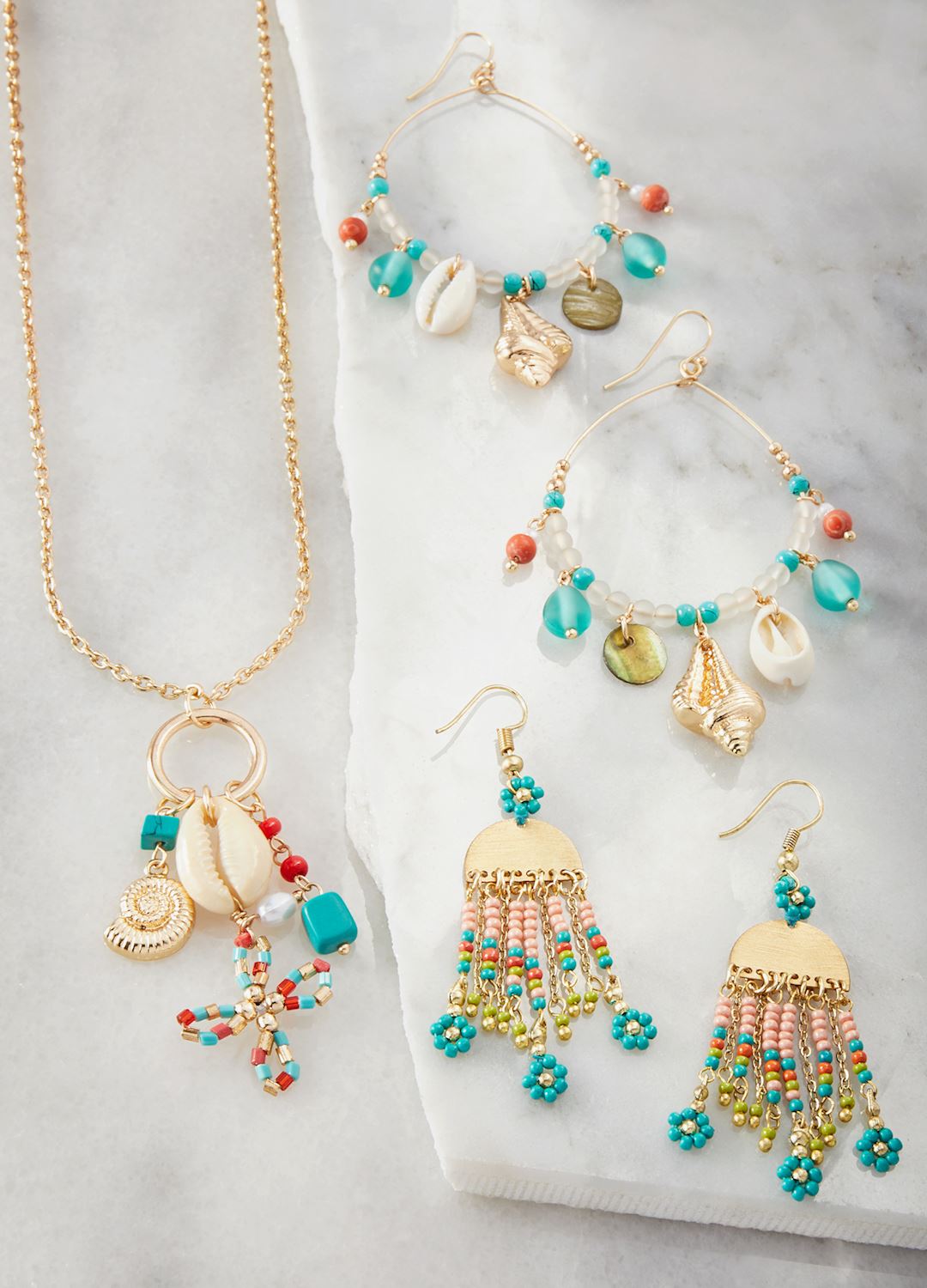 A gorgeous collection in gold and turquoise with hits of color and seaside charms. The perfect grouping of hook earrings and pendant necklace for soaking up the sun.