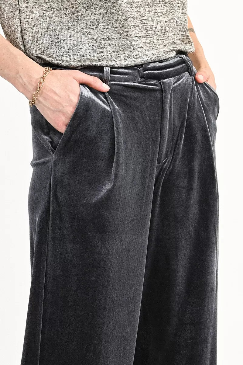 New silhouette for the season in wide and fluid velvet pants. High waist, side pockets.