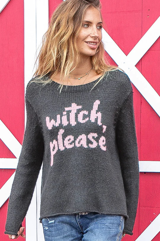 Incredibly soft and cozy crew featuring the phrase "witch, please" knit directly onto the center front. The knit has a super flattering boxy fit yet relaxed with a slight crop. Made with our buttery-soft yarn, this is super cozy yet lightweight. Distressing is added in various parts throughout the sleeves and body for a laidback look.